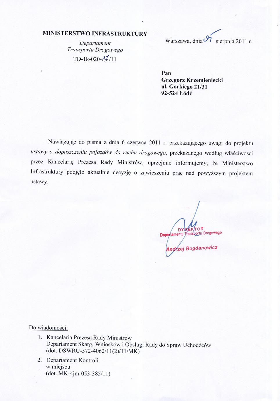 List do Premiera - w sprawie projektu ustawy o dopuszczeniu pojazdów do ruchu drogowego z dnia 24.05.2011 r.